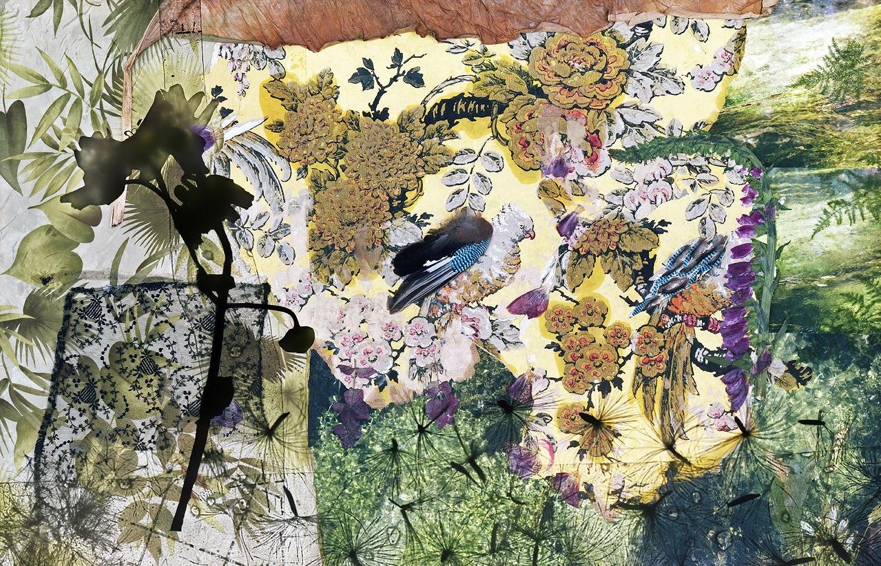 When I grew up in the sixties doodling and drawing in big wallpaper pattern books, most of the patterns were, of course like nowadays, botanic motives, springtime leaves, colorful blossoms, nature fakes intended to paper the walls of our sweet homes. Obviously these infantile pictorial impressions shaped my mind; I reflect upon these influences in the series “somnambule flowers”, using decorative wallpapers depicting plants and natural forms as well as my own landscape photographs as starting base for my assemblages.