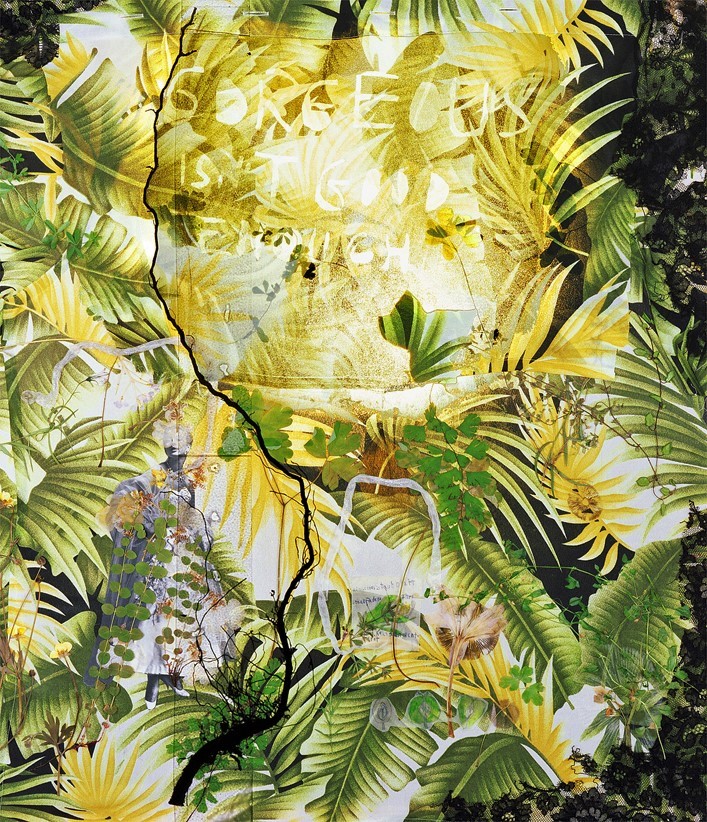 I try to create a regressive Garden of Eden with my own patterns of pressed blossoms, leaves, plant roots, lamella circles made by mushroom spores. These overall thikkets are even sometimes populated by jungle queens with magic-caps made out of dried and transparent blossoms, re-animated jaybirds, snakeskins, mushrooms and gold pheasants.